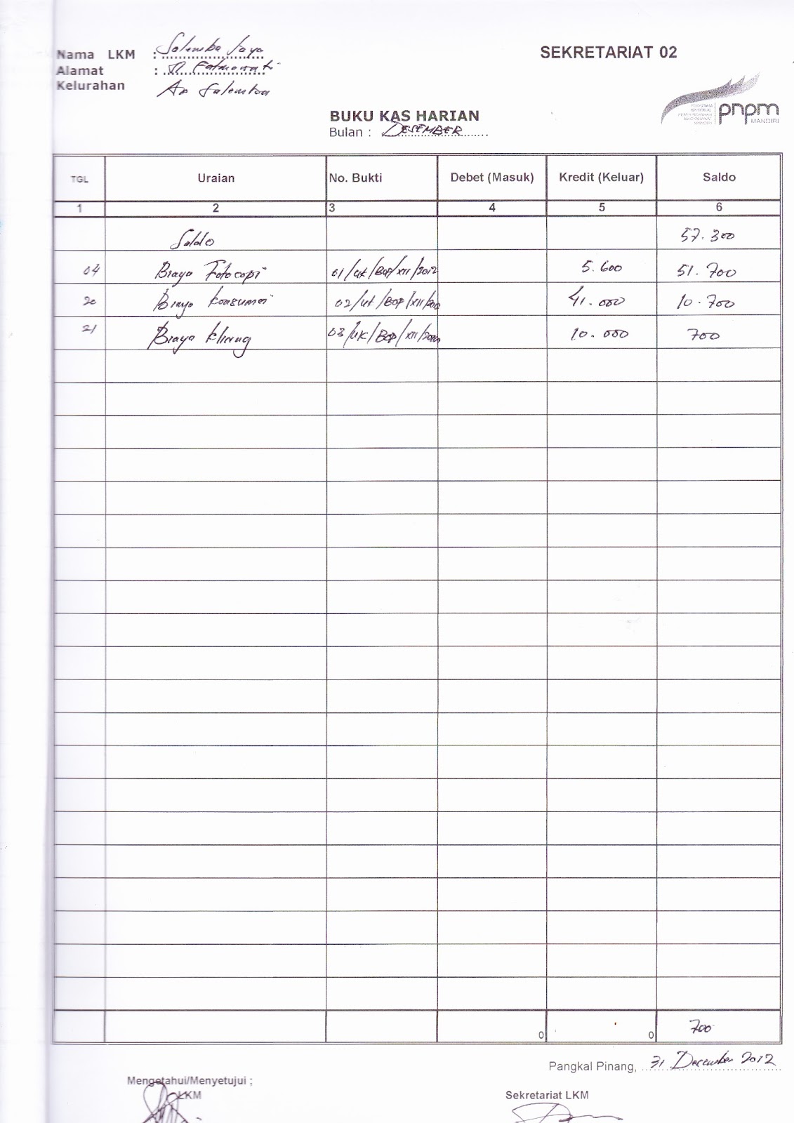 Buku Kas Harian Periode Desember 2012 LKM SALEMBA JAYA